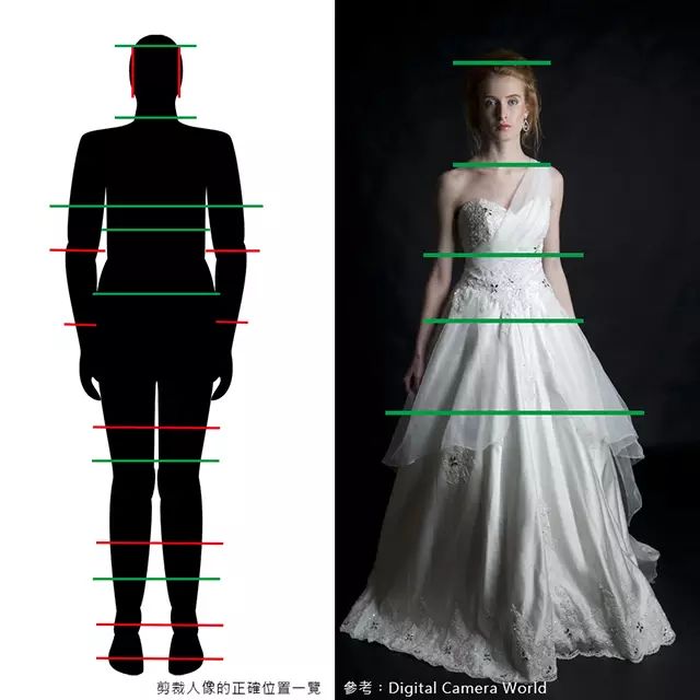 在人像构图裁剪时,应该避开关节处,如果不明白,请参考下图